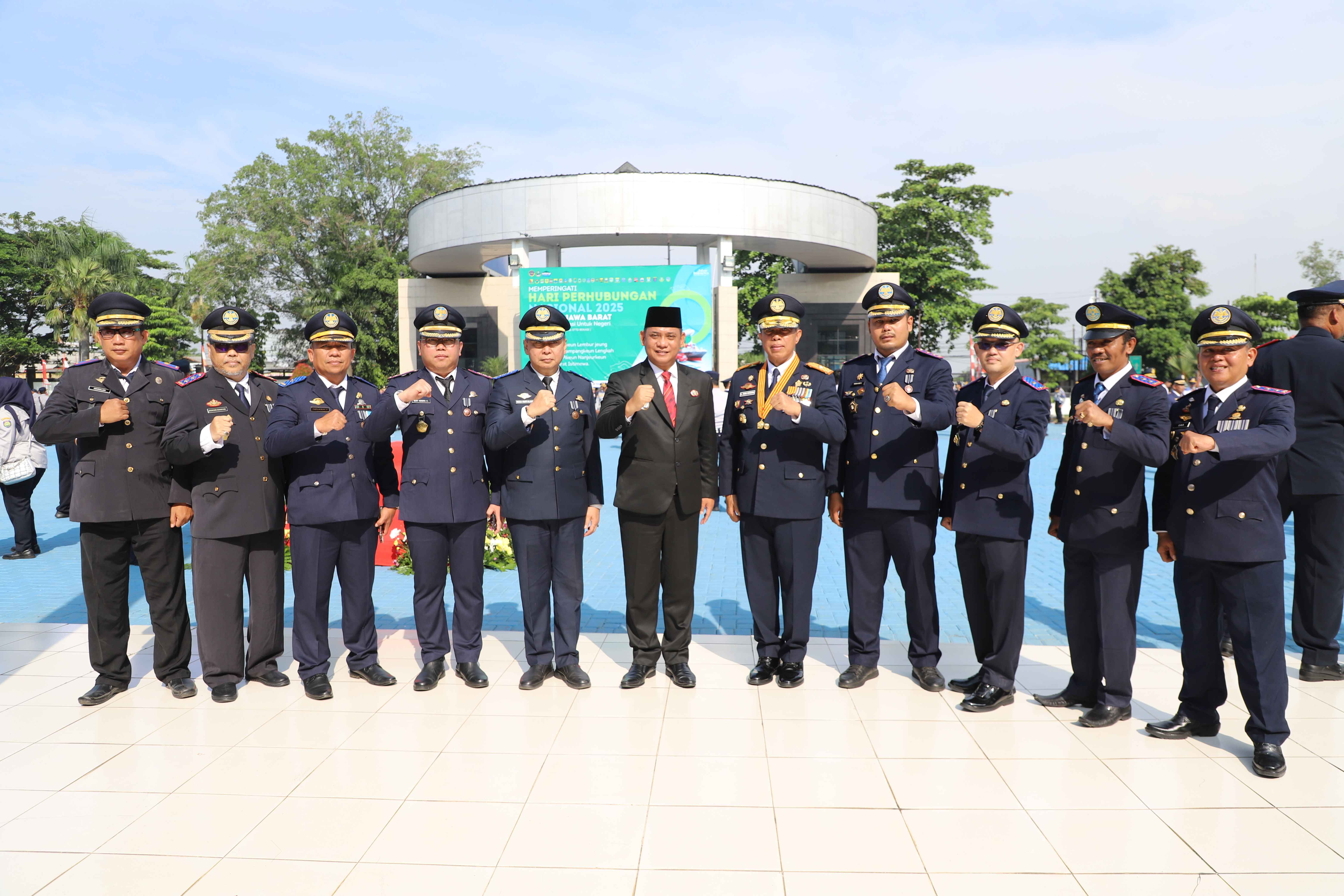 HARHUBNAS : Wakil Bupati Bekasi Asep Surya Atmaja mendampingi Wakil Gubernur Jabar Erwan Setiawan pada upacara peringatan Hari Perhubungan Nasional (Harhubnas) Tingkat Jawa Barat di Lapangan Sekolah Tinggi Transportasi Darat (STTD), Kecamatan Cibitung. Pada Sabtu, (20/09/2025). FOTO : Endar Raziq B/Diskominfosantik.